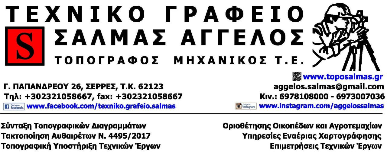 customer tabsΕπικοινωνίαΤο Τεχνικό Γραφείο – Σαλμάς Άγγελος δημιουργήθηκε το 2008 με σκοπό να προσφέρει υψηλήςποιότητας υπηρεσίες στους τομείς της Τοπογραφίας και των G.I.S. ικανοποιώντας τιςαπαιτήσεις και τις ανάγκες των πελατών του. Έχοντας εμπειρία ( μελέτη και κατασκευή )σε μελέτες διαφόρων ειδών και συνεργασίες με καταρτισμένους μηχανικούς, το τεχνικό μαςγραφείο είναι σε θέση να εγγυηθεί για την υψηλή ποιότητα των υπηρεσιών για κάθε εργασίαπου θα μας ανατεθεί. Αναλαμβάνουμε την μελέτη, συνεργαζόμαστε με τις ανάλογες αρμόδιεςδημόσιες υπηρεσίες και πράττουμε τα μέγιστα πρός όφελος των πελατών μας,Με σύμμαχο τηνσύγχρονη τεχνολογία έχουμε τη δυνατότητα εκπόνησης projects ειδικών απαιτήσεων, τόσο γιατον δημόσιο όσο και για τον ιδιωτικό τομέα, με τρόπο ταχύ και υπεύθυνο. Η διαρκής ενημέρωση,η παρακολούθηση των νέων δεδομένων, αποτελούν διαρκείς προτεραιότητες και συμβάλλουνστην ανάπτυξη εξειδικευμένων προσεγγίσεων και στην βελτιστοποίηση των επιλεγόμενων κατάπερίπτωση λύσεων. Το τεχνικό μας γραφείο αναλαμβάνει να σας εξυπηρετήσει επιστημονικά,γρήγορα και ολοκληρωμένα. Η έδρα μας βρίσκεται στο Νομό Σερρών αλλά εξυπηρετούμε όλεςτις περιοχές στη Βόρειο ΕλλάδαΑγρονόμοι - ΤοπογράφοιΤεχνικά Γραφεία και ΕταιρείεςΥπηρεσίεςΔόμηση - ΚατοικίαΠαπανδρέου Γεωργίου 26, ΣέρρεςΣΕΡΡΕΣΜΑΚΕΔΟΝΙΑ 2321058667 6978108000 69730070362321058667aggelos.salmas@gmail.comwww.toposalmas.grΤεχνικό Γραφείο - Σαλμάς Άγγελος Το προτείνω (έχει προταθεί 0 φορές) ΦωτογραφίεςFacebook LikeShare on FacebookTweet Widget