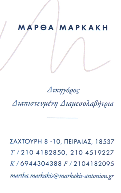 customer tabsΕπικοινωνίαΜαρκάκη Μάρθα - Διαπιστευμένη ΔιαμεσολαβήτριαΔικηγόροι και Δικηγορικά ΓραφείαΔιαπιστευμένος ΔιαμεσολαβητήςΥπηρεσίεςΣαχτούρη 8, ΠειραιάςΠΕΙΡΑΙΑΣ ΑΤΤΙΚΗΣΑΤΤΙΚΗΣΤΕΡΕΑ ΕΛΛΑΔΑ 2104182850 2104519227 69443043882104182095martha.markakis@markakis-antoniou.gr Το προτείνω (έχει προταθεί 0 φορές) ΦωτογραφίεςFacebook LikeShare on FacebookTweet Widget