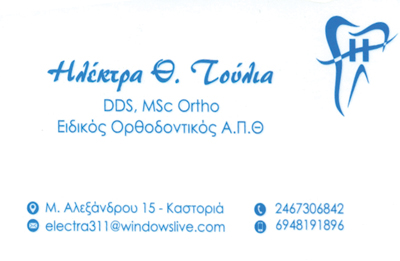 customer tabsΕπικοινωνίαΟρθοδοντική ενηλίκωνΟρθοδοντική παιδιώνΟρθοδοντικοίΥγείαΜεγ. Αλεξάνδρου 15, ΚαστοριάΚΑΣΤΟΡΙΑΜΑΚΕΔΟΝΙΑ 2467306842 6948191896drtoulia@gmail.comorthodontist-500.business.siteOρθοδοντικός Ηλέκτρα Θ. Τούλια Το προτείνω (έχει προταθεί 0 φορές) ΦωτογραφίεςFacebook LikeShare on FacebookTweet Widget