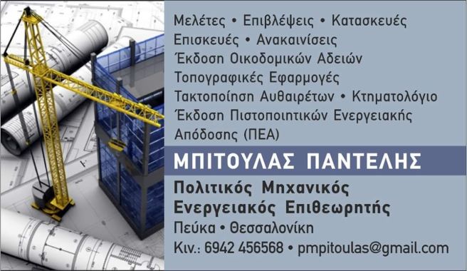 customer tabsΕπικοινωνίαΕξοικονομώ κατ’ Οίκον γ’ κύκλοςΤακτοποίηση ΑυθαιρέτωνΒεβαίωση ΜηχανικούΈκδοση Πιστοποιητικών Ενεργειακής Απόδοσης (Π.Ε.Α.)Έκδοση Οικοδομικών ΑδειώνΕπίβλεψη Οικοδομικών ΕργωνΜελέτη - Επίβλεψη - Κατασκευή - Επισκευές - ΑνακαινίσειςΤοπογραφικές Εφαρμογές - ΚτηματολόγιοΠολιτικοί ΜηχανικοίΔόμηση - ΚατοικίαΠεύκα, ΡετζίκιΠΕΥΚΑ ΘΕΣΣΑΛΟΝΙΚΗΣΘΕΣΣΑΛΟΝΙΚΗΜΑΚΕΔΟΝΙΑ 6942456568pmpitoulas@gmail.comΜπιτουλάς ΠαντελήςΜπιτουλάς Παντελής Το προτείνω (έχει προταθεί 0 φορές) ΦωτογραφίεςFacebook LikeShare on FacebookTweet Widget