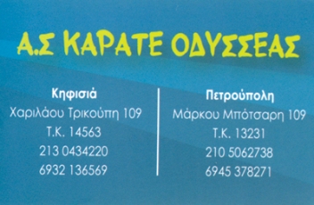 customer tabsΕπικοινωνίαΟ Αθλητικός Σύλλογος Οδυσσέας ιδρύθηκε το 1997 και μέχρι το 2003 είχε έδρα το Περιστέρι Αττικής.Σε μία προσπάθεια βελτίωσης και ανάπτυξης μεταφερθήκαμε σε έναν πολύ όμορφο χώρο στην διεύθυνση:Μάρκου Μπότσαρη 109 στην Πετρούπολη.Πρόσφατα ανοίξαμε ένα νέο γυμναστήριο στην Κηφισιά στην Χαριλάου Τρικούπη 109.Σήμερα στο δυναμικό του έχει πολλούς αθλητές που ασχολούνται συστηματικά με το άθλημα του ΚΑΡΑΤΕ.Είναι αναγνωρισμένος από την Γενική Γραμματεία Αθλητισμού (Γ.Γ.Α) και μέλος της Ελληνικής ΟμοσπονδίαςΚαράτε (ΕΛ.Ο.Κ).Στηρίζει τον πρωταθλητισμό και συμμετέχει σε όλα τα αναγνωρισμένα πρωταθλήματα. Έχει στο δυναμικό τουπολλούς αθλητές με Πανελλήνιες, Βαλκανικές, Μεσογειακές, Ευρωπαϊκές αλλά και Παγκόσμιες διακρίσεις.Το σύστημα το οποίο διδάσκεται είναι το SHITO RYU.Διοργανώνει το μεγαλύτερο και καλύτερο φιλικό πρωτάθλημα Καράτε με την επωνυμία «ΟΔΥΣΣΕΙΑ».Τα αποτελέσματα πραγματικά εντυπωσιάζουν και αυτό οφείλετε κυρίως στην σωστή τακτική που ακολουθείταιαπό τους προπονητές και τα μέλη του Δ.Σ.Αθλητικά Κέντρα και ΣχολέςΣχολές Πολεμικών ΤεχνώνΕκπαίδευσηΧαριλάου Τρικούπη 109, ΚηφισιάΚΗΦΙΣΙΑ ΑΤΤΙΚΗΣΑΤΤΙΚΗΣΤΕΡΕΑ ΕΛΛΑΔΑ 2130434220 6932136569info@odysseaskarate.grodysseaskarate.grΑ.Σ. Καράτε "ΟΔΥΣΣΕΑΣ" (Karate Club ''ODYSSEAS'') Το προτείνω (έχει προταθεί 0 φορές) ΦωτογραφίεςFacebook LikeShare on FacebookTweet Widget