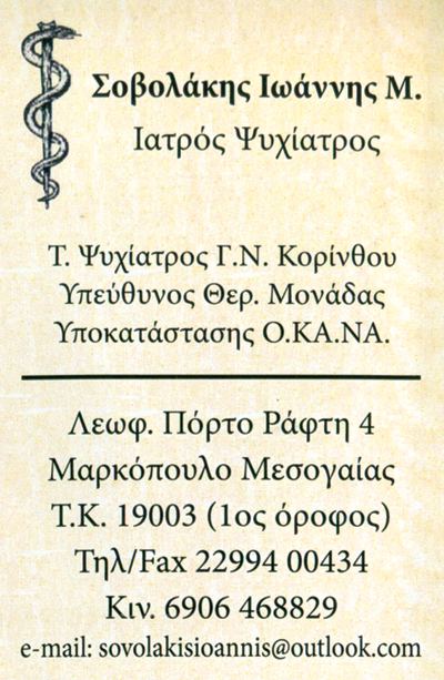 customer tabsΕπικοινωνίαΥπεύθυνος θεραπευτικής μονάδας υποκατάστασης Ο.ΚΑ.ΝΑ.Κατάθλιψη, Άγχος, ΦοβίεςΓηριατρική, Άνοια, ΑλτσχάιμερΑπεξάρτηση από ΝαρκωτικάΠιστοποιήσεις Οπλοφορίας, Security ΨυχίατροιΥγείαΛ. Πόρτο Ράφτη 4, ΜαρκόπουλοΜΑΡΚΟΠΟΥΛΟ ΜΕΣΟΓΑΙΑΣ ΑΝΑΤΟΛΙΚΗΣ ΑΤΤΙΚΗΣΑΤΤΙΚΗΣΤΕΡΕΑ ΕΛΛΑΔΑ 2299400434 69064688292299400434sovolakisioannis@outlook.com Το προτείνω (έχει προταθεί 0 φορές) ΦωτογραφίεςFacebook LikeShare on FacebookTweet Widget