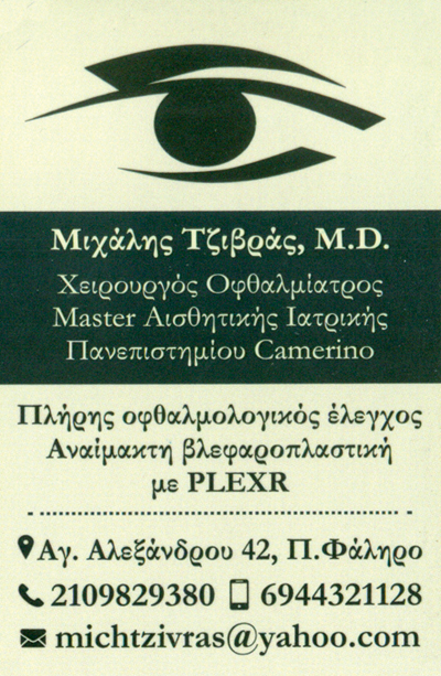customer tabsΕπικοινωνίαΧειρουργός ΟφθαλμίατροςΑισθητική ΙατρικήΣυνεργάτης Ιατρικού ΑθηνώνMaster Αισθητικής Ιατρικής Πανεπιστημίου Camerino ΙταλίαςΔέχεται με ραντεβούΟφθαλμίατροιΥγείαΑγίου Αλεξάνδρου 42, Παλαιό ΦάληροΠΑΛΑΙΟ ΦΑΛΗΡΟ ΑΤΤΙΚΗΣΑΤΤΙΚΗΣΤΕΡΕΑ ΕΛΛΑΔΑ 2109829380 6944321128mtzivras@gmail.comΜιχάλης Τζιβράς Οφθαλμολογικό Ιατρείο Το προτείνω (έχει προταθεί 1 φορές) ΦωτογραφίεςFacebook LikeShare on FacebookTweet Widget