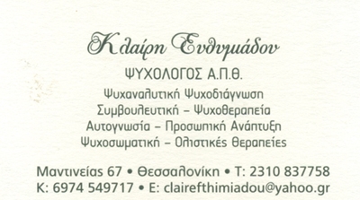 customer tabsΕπικοινωνίαΨυχαναλυτική Ψυχοδιάγνωση-Προβολικά Τεστ ΠροσωπικότηταςΣυμβουλευτική- ΨυχοθεραπείαΑυτογνωσία - Προσωπική ΑνάπτυξηΨυχοσωματική- Ιατρική ΨυχολογίαΟλιστικές Θεραπείες (Ανθοϊάματα Dr.Bach, Κρυσταλλοθεραπεία, Υoga Relaxation) Διαδικτυακές Συνεδρίες μέσω βιντεοκλήσης (On-line)Δέχεται Καθημερινά Κατόπιν ΡαντεβούΨυχολόγοιΨυχοθεραπευτέςΥγείαΜαντινείας 67, Πλατεία Καουδη, Θεσσαλονίκη (3ος όροφος)ΘΕΣΣΑΛΟΝΙΚΗ ΘΕΣΣΑΛΟΝΙΚΗΣΘΕΣΣΑΛΟΝΙΚΗΜΑΚΕΔΟΝΙΑ 2310837758 6974549717clairefthimiadou@yahoo.gr Το προτείνω (έχει προταθεί 1 φορές) ΦωτογραφίεςFacebook LikeShare on FacebookTweet Widget