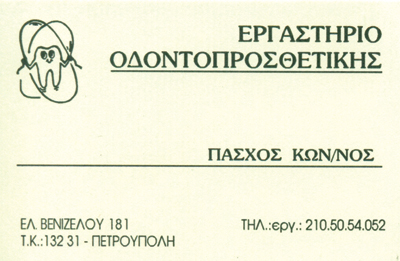 customer tabsΕπικοινωνίαΟδοντοτεχνίτες και Οδοντοτεχνικά ΕργαστήριαΥγείαΕλ. Βενιζέλου 181, ΠετρούποληΠΕΤΡΟΥΠΟΛΗ ΑΤΤΙΚΗΣΑΤΤΙΚΗΣΤΕΡΕΑ ΕΛΛΑΔΑ 2105054052 6946758284kpasxospetr@gmail.com Το προτείνω (έχει προταθεί 0 φορές) ΦωτογραφίεςFacebook LikeShare on FacebookTweet Widget