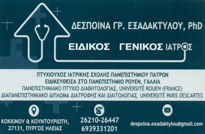 customer tabsΕπικοινωνίαΠτυχιούχος ιατρικής σχολής Πανεπιστημίου ΠατρώνΕιδικευθείσα στο Πανεπιστήμιο Ρουεν της Γαλλίας.Δέχεται καθημερινά με ραντεβού.Γενική ΙατρικήΥγείαΚοκκίνου και Κουντουριώτη, ΠύργοςΠΥΡΓΟΣ ΗΛΕΙΑΣΗΛΕΙΑΠΕΛΟΠΟΝΝΗΣΟΣ 2621026447 6939331201despoina.exadaktylou@gmail.com Το προτείνω (έχει προταθεί 0 φορές) ΦωτογραφίεςFacebook LikeShare on FacebookTweet Widget