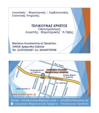 customer tabsΕπικοινωνίαΗ εταιρεία μας με την μακρόχρονη εμπειρία που διαθέτει έρχεται να δώσει οριστικές λύσεις στην εύρυθμη λειτουργία του νοικοκυριού και καθε μορφής επιχείρησης.Η σωστή σύνταξη και υποβολή των φορολογικών και λοιπών δηλώσεων γίνεται με τακτική, υπεύθυνη και έγκαιρη συμβουλευτική καθοδήγηση μέσω της μηχανογράφησης στα συμβάντα του εκάστοτε φορολογικού έτος.Το γραφείο μας εγγυάται τα παραπάνω και συνεργάζεται με επαγγελματίες (Δικηγόρο, Συμβολαιογράφο, Μηχανικό, Ασφαλιστή) για τη σίγουρη και αποτελεσματικότερη εξυπηρέτηση σας.Λογιστικές- Φοροτεχνικές ΥπηρεσίεςΥπηρεσίεςΒασιλέως Κωνσταντίνου 46, ΑμάρυνθοςΑΜΑΡΥΝΘΟΣ ΕΥΒΟΙΑΣΕΥΒΟΙΑΣΤΕΡΕΑ ΕΛΛΑΔΑ 2229300387 6944979598xtsilikounas@gmail.comwww.tsilikounas.grΛογιστικό Φοροτεχνικό Γραφείο - Τσιλίκουνας Χρήστος Το προτείνω (έχει προταθεί 0 φορές) ΦωτογραφίεςFacebook LikeShare on FacebookTweet Widget