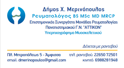 customer tabsΕπικοινωνίαΟ Ρευματολόγος Δήμος Χ. Μερινόπουλος αποφοίτησε από την Ιατρική Σχολή του Πανεπιστημίου Κρήτης (2010) και ειδικεύτηκε στην Εσωτερική Παθολογία και Ρευματολογία στο Ηνωμένο Βασίλειο (2011-2021) με εξειδίκευση στο υπερηχογράφημα μυοσκελετικού. Διατηρεί ιδιωτικό Ιατρείο στην Άμφισσα και είναι επιστημονικός συνεργάτης στη Μονάδα Ρευματολογίας και Κλινικής Ανοσολογίας του Πανεπιστημιακού Γενικού Νοσοκομείου "ΑΤΤΙΚΟΝ". Είναι μέλος του General Medical Council (Specialist Register) του Ηνωμένου Βασιλείου, της Βρετανικής Ρευματολογικής Εταιρείας (British Society for Rheumatology), του Ιατρικού Συλλόγου Άμφισσας, της Ελληνικής Ρευματολογικής Εταιρείας και της ελληνικής ομάδας εκπαίδευσης Ρευματολόγων στο υπερηχογράφημα μυοσκελετικού, ΜΙΤΟΣ.Ο ιατρός δέχεται κατόπιν ραντεβού, ώρες λειτουργίας 8:00 - 13:00 και 18:00 - 20:00 καθημερινά εκτός Τετάρτης, Σαββάτου και Κυριακής.Ρευματοειδής αρθρίτιδαΟστεοαρθρίτιδαΟστεοπόρωσηΨωριασική αρθρίτιδαΑγκυλοποιητική σπονδυλαρθρίτιδαΟσφυαλγίαΙσχιαλγίαΠόνοςΣυστηματικός ερυθηματώδης λύκοςΥπέρηχος μυοσκελετικού ΡευματολόγοιΥγείαΡήγα Κοντορήγα Ευθ, Γιδόγιαννου 7, Άμφισσα 331 00Πανεπιστημιακό Γενικό Νοσοκομείο "Αττικόν", Ρίμινι 1, ΧαϊδάριΑΜΦΙΣΣΑ ΦΩΚΙΔΑΣΧΑΪΔΑΡΙ ΑΤΤΙΚΗΣΛΑΜΙΑ ΦΘΙΩΤΙΔΑΣΛΙΒΑΔΕΙΑ ΒΟΙΩΤΙΑΣΝΑΥΠΑΚΤΟΣ ΑΙΤΩΛΟΑΚΑΡΝΑΝΙΑΣΦΩΚΙΔΑΣΤΕΡΕΑ ΕΛΛΑΔΑΑΤΤΙΚΗΦΘΙΩΤΙΔΑΒΟΙΩΤΙΑΑΙΤΩΛΟΑΚΑΡΝΑΝΙΑ 2265072501 6988281948dmerinopoulos@gmail.com Το προτείνω (έχει προταθεί 1 φορές) ΦωτογραφίεςΠροσφορές Ρευματολογικό Ιατρείο ΆμφισσαςFacebook LikeShare on FacebookTweet Widget