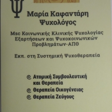 Ψυχολογος MSc - Συστημική Ψυχοθεραπευτρια Ατομική Συμβουλευτική και Ψυχοθεραπεία Θεραπεία Οικογένειας Θεραπεία Ζευγους Οι συνεδρίες πραγματοποιούνται κατόπιν τηλεφωνικού ραντεβού,δια ζώσης και διαδικτυακά.