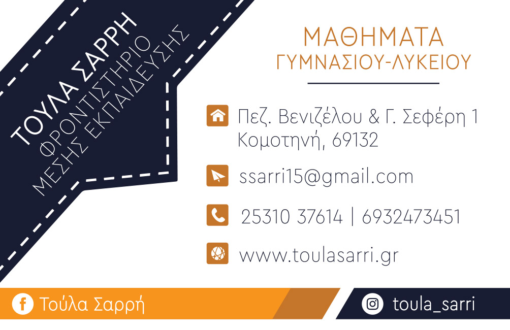 customer tabsΕπικοινωνίαΣτο Φροντιστήριο Μέσης Εκπαίδευσης: "Τούλα Σαρρή" διδάσκονται μαθήματα Γυμνασίου, Λυκείου όλων των Ομάδων Προσανατολισμού & μαθήματα ΕΠΑΛ. Επαγγελματικός Προσανατολισμός Μαθητών. Βοήθεια για τη συμπλήρωση του Μηχανογραφικού Δελτίου.Φροντιστήρια Μέσης Εκπαίδευσης και Εισαγωγικών Εξετάσεων Ανωτάτων ΣχολώνΕκπαίδευσηΕλευθερίου Βενιζέλου & Γεωργίου Σεφέρη 1, Κομοτηνή (1ος όροφος)ΚΟΜΟΤΗΝΗ ΡΟΔΟΠΗΣΡΟΔΟΠΗΘΡΑΚΗ 2531037614 6932473453 69324734512531037614ssarri15@gmail.comwww.toulasarri.grΤούλα Σαρρή: Φροντιστήριο Μέσης Εκπαίδευσηςtoula_sarriToula Sarri Το προτείνω (έχει προταθεί 1 φορές) ΦωτογραφίεςFacebook LikeShare on FacebookTweet Widget