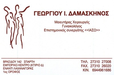 customer tabsΕπικοινωνίαΕπιστημονικός συνεργάτης ΙΑΣΩ.Ωράριο:Καθημερινά πρωί 09.00 - 13.00Απογεύματα: Τρίτη - Πέμπτη - Παρασκευή 17.00 - 20.00Μαιευτήρες - ΓυναικολόγοιΥγείαΒρασίδου 142, 23100ΣΠΑΡΤΗ ΛΑΚΩΝΙΑΣΛΑΚΩΝΙΑΠΕΛΟΠΟΝΝΗΣΟΣ 2731027008 69449616862731026020dam_georgiou@yahoo.gr Το προτείνω (έχει προταθεί 0 φορές) ΦωτογραφίεςFacebook LikeShare on FacebookTweet Widget