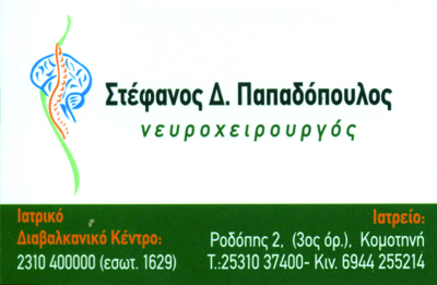 Νευροχειρουργική, Καλαμαριά.Νευροχειρουργική, Θεσσαλονίκη.Όγκος εγκεφάλου, Θεσσαλονίκη.Οσφυαλγία, Καλαμαριά.Αυχενικό σύνδρομο, Καλαμαριά. Ιδιώτης ιατρός. Συνεργάτης του Ιατρικού Διαβαλκανικού Κέντρου Θεσσαλονίκης.Ογκολογία - χειρουργική κρανίου - χειρουργική σπονδυλικής στήλης - αντιμετώπιση αυχενικού συνδρόμου.