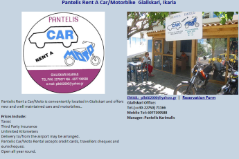 customer tabsΕπικοινωνίαPantelis Rent a Car/Moto is conveniently located in Gialiskari and offers new and well maintained cars and motorbikes..Prices Include:TaxesThird Party InsuranceUnlimited KilometersDelivery to/from the airport may be arranged.Pantelis Car/Moto Rental accepts credit cards, travellers cheques and eurocheques.Open all year roundΕνοικιάσεις ΑυτοκινήτωνΕνοικιάσεις Μοτοσικλετών και ΜοτοποδηλάτωνΤουρισμόςΓιαλισκάρι, Ικαρία, Νομός ΣάμουΙΚΑΡΙΑ ΣΑΜΟΥΣΑΜΟΣΝΗΣΙΑ ΑΙΓΑΙΟΥ ΠΕΛΑΓΟΥΣ 2275071166 69771995882275071166pik662000@yahoo.gr Το προτείνω (έχει προταθεί 0 φορές) ΦωτογραφίεςFacebook LikeShare on FacebookTweet Widget