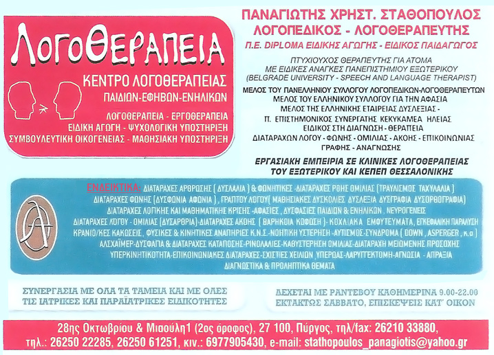 customer tabsΕπικοινωνίαΛογοπεδικοί - ΛογοθεραπευτέςΥπηρεσίεςΥγεία28ης Οκτωβρίου & Μιαούλη 1, Πύργος, ΗλείαΠΥΡΓΟΣ ΗΛΕΙΑΣΗΛΕΙΑΠΕΛΟΠΟΝΝΗΣΟΣ 2621033880 2625022285 οικίας 2625061251 οικίας 69779054302621033880stathopoulos_panagiotis@yahoo.gr Το προτείνω (έχει προταθεί 0 φορές) ΦωτογραφίεςFacebook LikeShare on FacebookTweet Widget